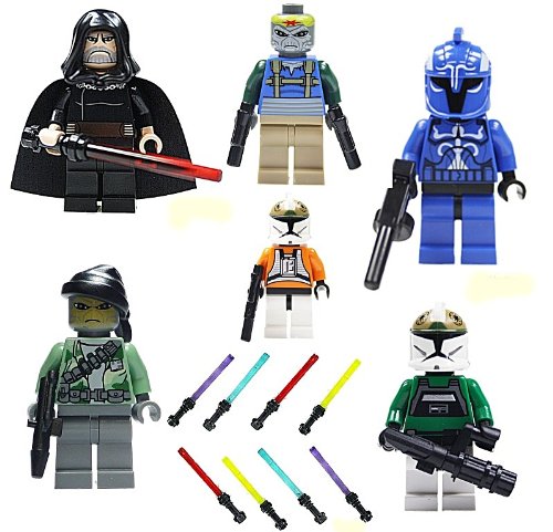 Beschreibung : LEGO Star Wars Minifiguren - 6 Figuren Custom Set plus 8 Laserschwerter. Nur Original LEGO Teile, keine Magnetfiguren, jede Figur in seine Einzelteile zerlegbar.